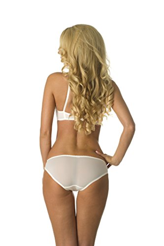Sheer demi bra with a lace eyelet overlay over a sheer bust cup. Bra features underwire cups, adjustable straps, and hook and eye closure. Includes matching panty with sheer sides. Hot and sexy. Makes a perfect gift for a girlfriend or wife.Feature