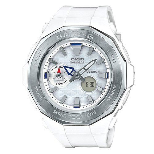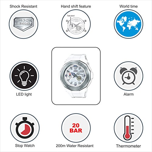 Brand, Seller, or Collection Name:Casio Model number:BGA-225-7ADR (B191) Part Number:BGA-225-7ADR (B191) Model Year:2017 Item Shape:Round Dial window material type:Mineral Display Type:Analog and digital Clasp:Buckle Case material:Resin Case diameter:45.5 millimeters Case Thickness:15.1 millimeters Band Material:Resin Band length:Women's Standard Band width:19 millimeters Band Color:White Dial color:White Special features:Light, Shock resistant, World time Item weight:1.92 Ounces Movement:Japanese quartz Water resistant depth:200 Meters