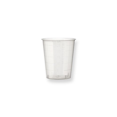 -. Feature : Measuring cup with 1 - 30mL graduated marking / Made of polypropylene / Clear color / 30mL Capacity / Non-sterile