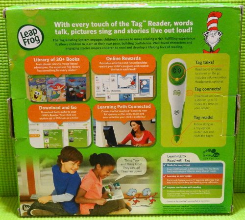 -. Binding : Toy -. Brand : LeapFrog -. EAN : 0708431207042 -. Feature : The amazing touch technology of the Tag Reading System encourages a child's love of reading as words talk, pictures sing and stories live out loud / The Tag library includes over 30 books and games based on favorite TV, movie and classic tales / Tag storybooks and learning activities help children build vocabulary / The Tag reader now holds audio for up to 10 books at a time and comes with the hardcover classic Dr. Seusss The Cat in the Hat / Parents can connect the Tag Reader online to collect fun rewards / Includes reading skills such as word recognition, reading comprehension and phonics skills / Their child has earned and to see their child's play and learning on the LeapFrog Learning Path -. IsAdultProduct : 0 -. IsAutographed : 0 -. IsMemorabilia : 0 -. Label : Leapfrog -. Manufacturer : Leapfrog -. Model : 80-20704E -. MPN : 80-20704E -. NumberOfItems : 1 -. PackageQuantity : 1 -. PartNumber : 80-20704E -. ProductGroup : Toy -. ProductTypeName : TOYS_AND_GAMES -. Publisher : Leapfrog -. SKU : VS169337 -. Studio : Leapfrog -. Title : LeapFrog Tag Reading System (32 MB) -. UPC : 708431207042 -. Warranty : The LeapFrog® product is warranted only to the original purchaser for a period of three months from the original purchase date.