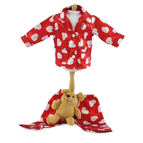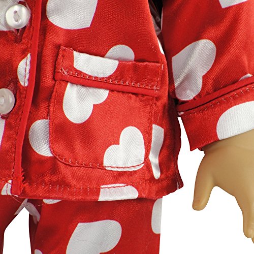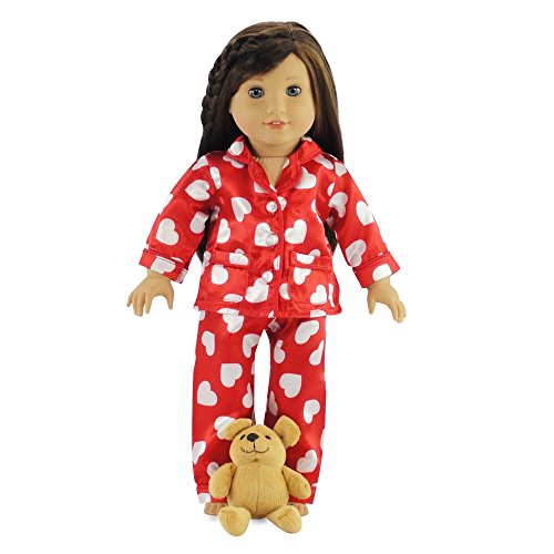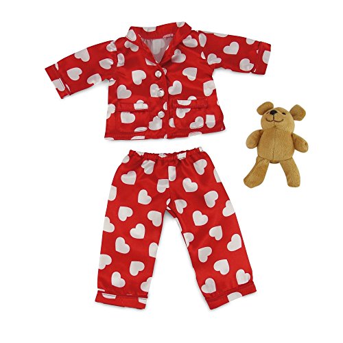Nothing says LOVE like silky pajamas! This great red and white heart pajama top and bottom two piece sleepwear comes with an adorable doll size teddy bear. This outfit will keep your 18 inch doll cozy and comfy at bedtime. *Doll Not Included*
