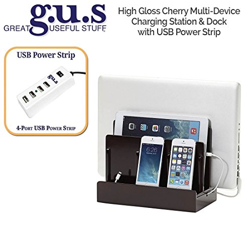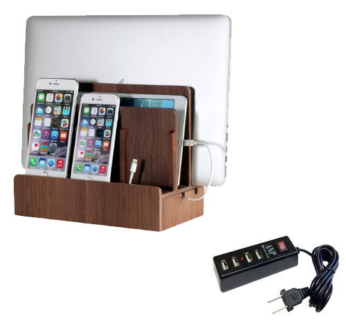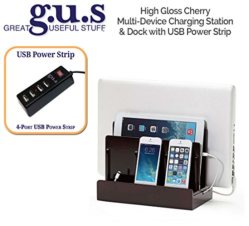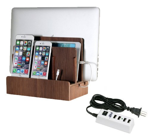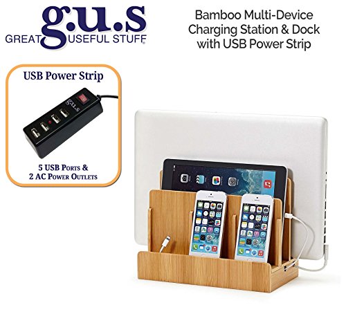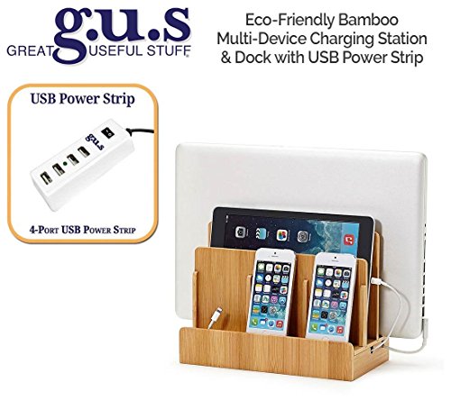 The Bamboo Multi-Device Charging Station is the perfect desktop accessory for your tech organization problems. There's room to store a laptop, tablet and up to three other mobile devices like smartphones, cell phones or portable gaming devices. The bottom of the charging station has a magnetic base that flips open to reveal a hidden storage area for organizing the wires that would otherwise clutter your desk space. The built in elastic straps keep everything tidy and in its right place. The attractive 100% bamboo finish looks great with almost any home or office decor. This charging dock is compatible with all personal media devices; smart phones, iPad, iPhone, Android, Nexus, Samsung, HP, Apple Laptops, and any sized tablet. Keep all your favorite portable media organized with this attractive and useful charging station. Made of 100% eco-friendly bamboo. Exterior Dimensions: 10" L x 9" H x 5.22" D. Vertical slots measure 1.25" wide and accommodate most laptops and tablets. Cord Concealing Base Dimensions 10" L x 1" H x 5.22" Power Cords not included. All Charging Stations are available with or without USB Power Supply. Please select options above. *The design of this product is the trademark of Blockware LLC / Great Useful Stuff. Registration Reg. No 4,733,389. Licensed under U.S. Patent No. 6,982,542Feature
