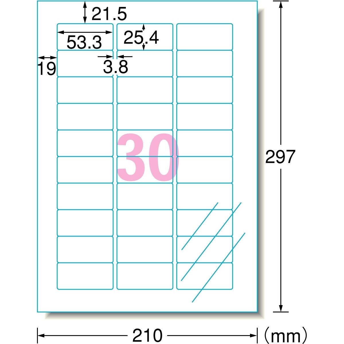光沢フィルム・透明/材質:ポリエステルフィルム/標準総厚み:0.15mm/ラベル厚み:0.07mm A4 30面/シートサイズ:A4判 (210mm×297mm)/ラベルサイズ:53.3mm×25.4mm(3列×10段) 対応プリンタ: インクジェット(染料)