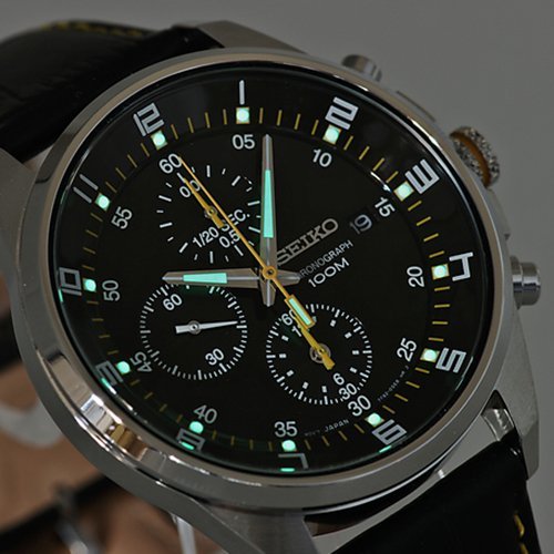 Stainless steel case measures 43mm diameter by 10mm thick.Black genuine leather strap includes a convenient stainless steel buckle.Classic black dial has matching luminous hands and markers.Date display at the third hour.Chronograph function measures up to twelve hours of activity in 1/20 second increments.A scratch resistant Hardlex crystal protects the precise Quartz movement.Water resistant to 100 meters.