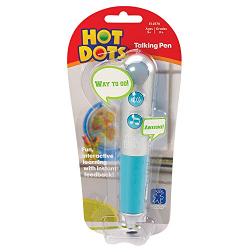 The best-selling, interactive Hot Dots Talking Pen has a brand new look! Press the sleek, silver Pen to an answer dot on any Hot Dots or Hot Dots Jr. question for instantaneous visual and audio feedback! With 17 speech and sound effects and fun, flashing lights, the Hot Dots Talking Pen is perfect for independent, self-paced learning, guiding kids through dozens of interactive books, activities, and card sets. The Hot Dots Talking Pen is compatible with all Hot Dots and Hot Dots Jr. sets and requires 2 AAA batteries.