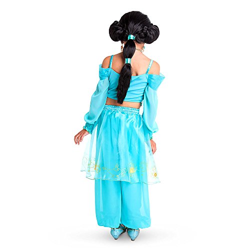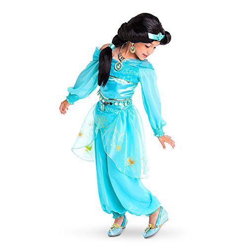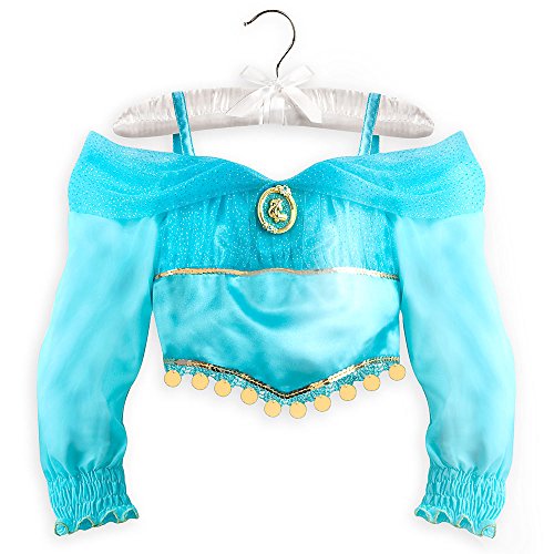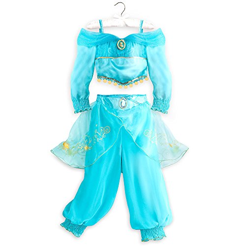 -. Brand : Disney -. Color : Blue -. Department : Girls -. Feature : Two-piece set includes top and pants Top features satin panel edged with gold sequins Pleated tulle top section and shoulder bands flecked with glitter Lace trim at hem is edged with band of dangling gold discs Top has crepe sleeves with smocking detail at cuffs edged with gold foil thread Jasmine cameo with glitter Stretch fabric back panel for comfy fit Crepe pants feature elastic waistband, and organza top skirt with gold design Smocking detail at ankles edged with gold foil thread Waistband accented with large faceted jewel -. PackageQuantity : 1 -. ProductGroup : Apparel -. ProductTypeName : CHILDRENS_COSTUME -. Title : Disney Store Little Girls 2 Piece Aladdin Princess Jasmine Costume