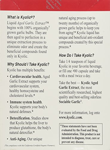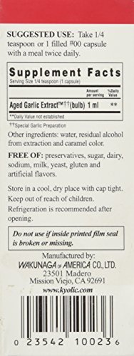 -. Binding : Health and Beauty -. Brand : Kyolic -. Department : Health and Beauty>Health and Wellness -. EAN : 0023542100236 -. Feature : Recommend: As a dietary supplement, take 1/4 to 1/2 teaspoon, or 30 to 60 drops (one or two filled capsules, size #00) with a meal twice daily. Or, enjoy in a Kyolic Kocktail. / Does Not Contain: Garlic Odor. Dairy, Sodium,Yeast. / Disclaimer: This website is for informational purposes only. Always check the actual product label in your possession for the most accurate ingredient information due to product changes or upgrades that may not yet be reflected on our web site. These statements made in this website have not been evaluated by the Food and Drug Administration. The products offered are not intended to diagnose, treat / Serving Size: 30-60 drops -. IsAdultProduct : 0 -. IsAutographed : 0 -. IsMemorabilia : 0 -. Label : Kyolic -. LegalDisclaimer : * These statements have not been evaluated by the Food and Drug Administration. This product is not intended to diagnose, treat, cure or prevent any disease. ** Always refer to the manufacturer's label on the product for description, recommended dose and precautions. -. Manufacturer : Kyolic -. Model : 023542100236 -. MPN : 023542100236 -. NumberOfItems : 1 -. PackageQuantity : 1 -. PartNumber : 023542100236 -. ProductGroup : Health and Beauty -. ProductTypeName : HEALTH_PERSONAL_CARE -. Publisher : Kyolic -. Size : 4 Oz -. Studio : Kyolic -. Title : KYOLIC Liquid - Plain - 4 oz - Liquid(includs 2 pack of 2 oz bottle) -. UPC : 129500952425