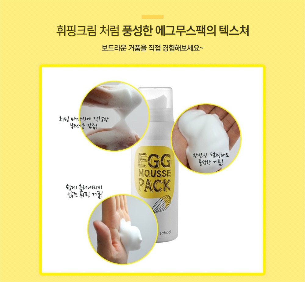 Too Cool for School Egg Mousse Pack is a wash off type essence pack with very soft texture.