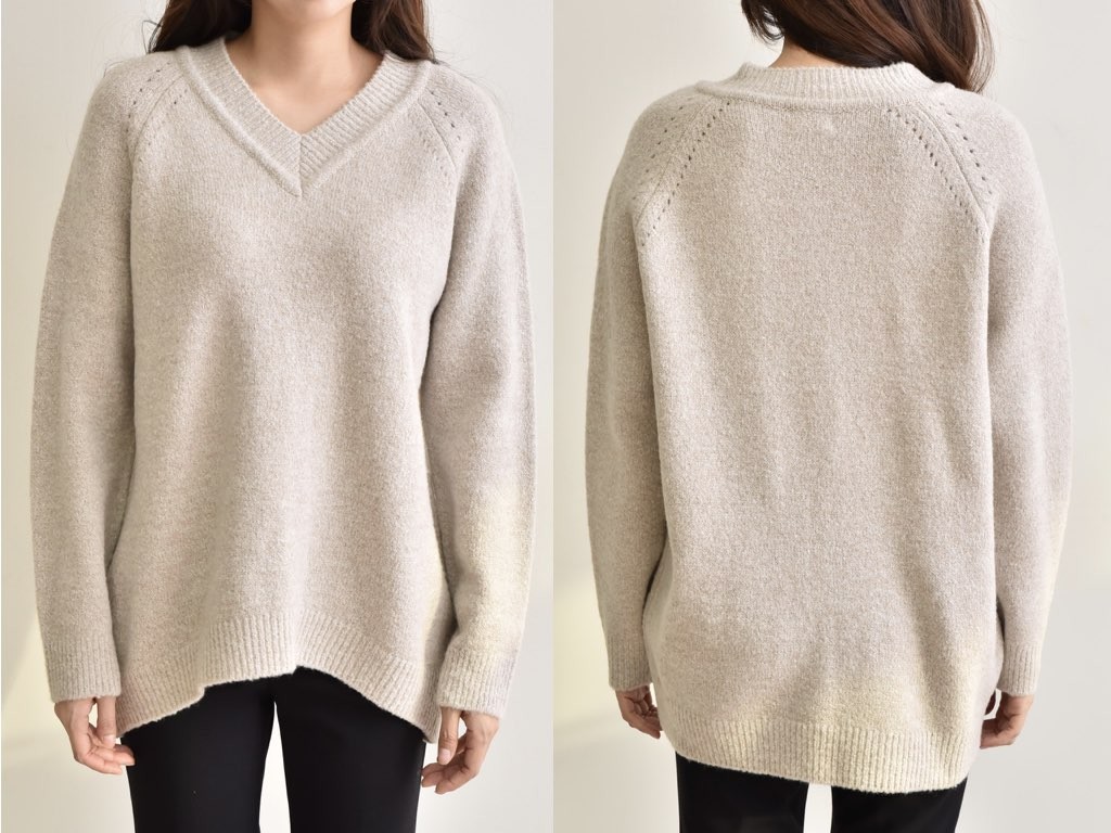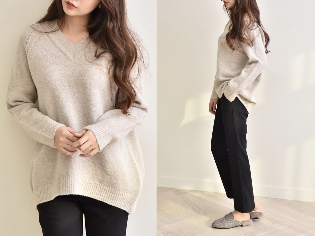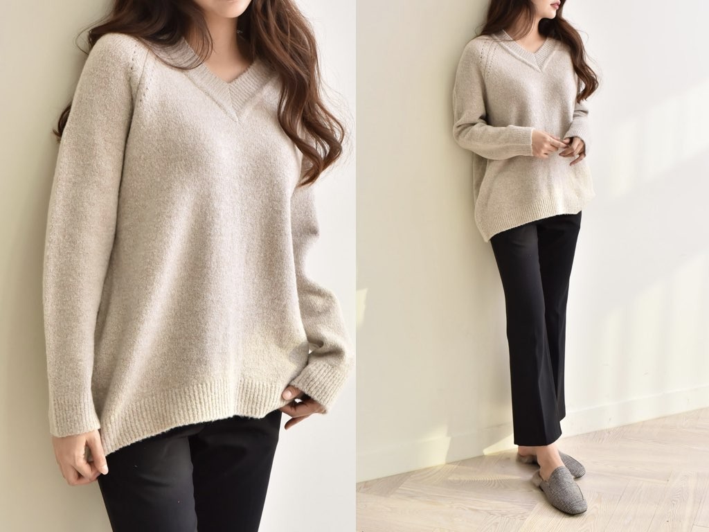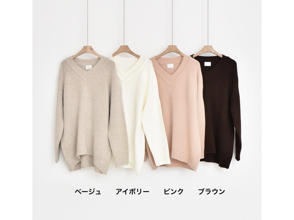 4色展開のVネック ニットです。ゆったりとしたデザインとなっており、着丈(前):68cm、着丈(後):73cmと前側が長いデザインとなっています。ゆったりとしたシルエットは、こなれ感が抜群です。1.基本情報色:4色展開(ベージュ/アイボリー/ピンク/ブラウン)サイズ:Free素材:アクリル67%、ウール10%、ナイロン20%、スパン3%製造国:Korea2.サイズ情報肩幅:ナグランデザイン身幅(胸断面):55cm 腕の長さ:67cm 着丈(前):68cm着丈(後):73cm(サイズは計る方法に応じて±2〜3cmの誤差があります。ご了承お願い致します)モデル着用サイズ:F※着用モデル(163cm、体重47kg、足のサイズ24.5cm)3.その他の情報厚み:中間透け感:なし伸縮性:高裏地:なし洗濯方法:ドライ(クリーニング)[注意事項]お取り寄せ商品は、海外より仕入れるため納品まで約10日前後いただきます。また店舗でも販売しており、在庫切れになる場合もございます。ご了承お願い致します。