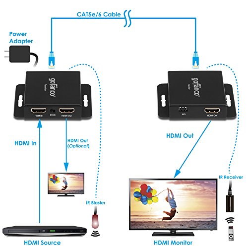 gofanco 165ft 1080p HDMI Extender over a single CAT5e/CAT6 Ethernet cable with loop out local output and remote IR control – Up to 165ft (50m) distance at 1080p resolution