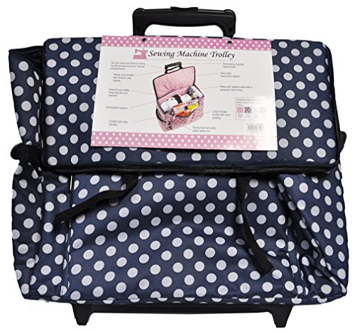 -. Feature : Sewing Machine Trolley Navy and White Polka Dot / Features: Top zips open and hooks to trolley handle for easy access to internal compartments. Sturdy dual handles with Hook & Loop closure. Hook & Loop safety strap secures your machine. Strong back support. Comfort grip handles. Telescoping lockable metal handle. Easy glide heavy duty zippers. Pillow soft padded walls with a protective nylon lining. Large storage pocket with extra padding. Strong base and wide stable wheel set. / Interior Dimensions: 19 X 8 X 14.