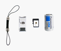 -. Feature : MicroSDカード(2GB・ イラスト入り) / USBカードアダプター(イラスト入り) / 電池(CR2) 1本 / ストラップ(ロゴ入り) / カメラポーチ(ロゴ入り)