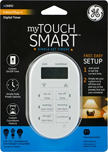 The GE MyTouchSmart Indoor Plug-In Digital Timer is an incredibly easy way to automate your lights to be on when you need them most. Featuring 1 polarized outlet, the time delivers simple automation for indoor lighting and electronics and is equipped with 3 preset buttons and a full 24-hour countdown option, letting you program the timer with ease. Save energy, save money and feel secure.Feature