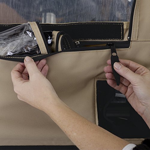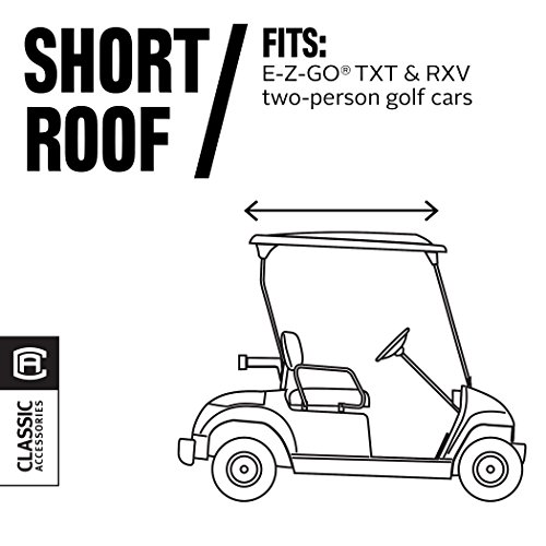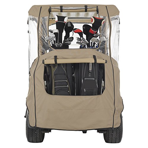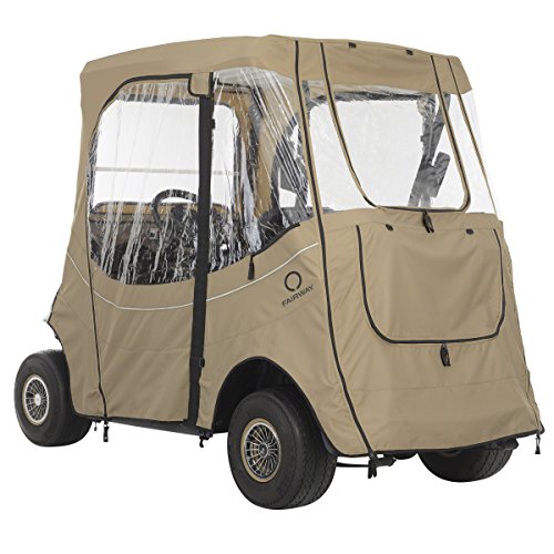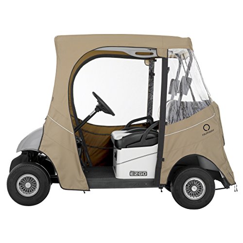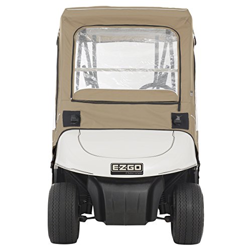 Fade safe E-Z-Go golf car enclosure. Custom fit for E-Z-Go Two-person golf cars. Short roof: Fits E-Z-Go TXT & RXV Two-person golf cars. Fade Safe solution-dyed fabric significantly reduces sun bleaching. Full protection against weather and wind. Fits over roof and secures with hooks on bottom. Quick zip-off windshield stores in front pocket. Keeps golf cars clean and dry. Super-clear window material with heavy-duty polyester walls and top. Zippered doors and panels adjust quickly and easily to any weather condition. Doors can be rolled back or completely removed. Windshield bumper access points. Interior and exterior zipper pulls for quick and easy access. Reflective piping for enhanced safety. Convenient carrying duffle bag with padded handles included. Color: Light Khaki. Four-year limited warranty.Feature