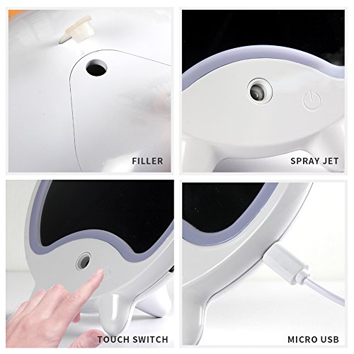 - 5.TOUCH SENSOR-----Just press the circle on the front of the lighted makeup mirror to adjust the brightness level to your desired level. Long press 2 s the switch button to start spraying , and setting 1.5 hours auto,long press 2 s again , closed it .