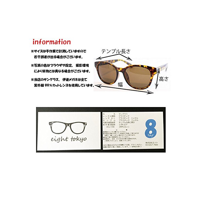 【eight tokyo】유행 발신원,도쿄에서 탄생 했 eye wear 브랜드 썬글라스를 중심으로 수 많은 안경을 다루고 있습니다.당브랜드는 안경의 본고장,후쿠이현 사바에시의 안경 메이커와 함께 일본인에게 어울리는 아이템을 디자인,기획을 하고 있습니다.동그라미(라운드)안경이나 검 ##고, 대모갑(차)의 다테 안경(클리어 렌즈)등 패션 아이템으로서는 물론,눈(째)의 보호나 화분증(꽃가루 알레르기) 대책,편광 렌즈등도 수없이 갖춰 있습니다. 맨즈도 레이디스도 심부름꾼 받을 수 있는 남녀 겸용 사이즈 입니다.