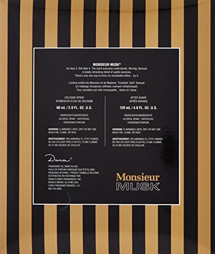 Studio : Dana Publisher : Dana Binding : Health and Beauty Product Description Monsieur Musk by Dana for Men 2 Pc. Gift Set ( Cologne Spray 2.0 Oz Aftershave 4.0 Oz ).A perfect matchless masculine fragrance by the name of Monsieur Musk was created and launched by Dana in 1973. This is specifically made for inducing romantic feelings in the opposite sex. Musk is particularly dominant than other notes such as rich spices, green notes and woody traits. This will lead you to spend a snug evening with the loved one. 0