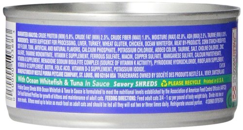 - Feature : Twenty-four (24) 5.5 Ounce Can of Purina Friskies Savory Shreds with Ocean Whitefish & Tuna in Sauce Cat Food / Thin Shreds / With Ocean Whitefish and Tuna in Sauce / 100% Complete & Balanced for the Growth of Kittens and Maintenance of Adult Cats / Manufactured in Purina-owned plants in the United States