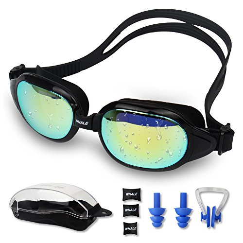 -. Feature : ▼LOOKS wonderful▼:- 6 SWIM GOGGLE FEATURES that every of them made for your needs: (1) Silicone cushions for comfort, (2) 100% U.V. Protection, (3) Anti-Fog Coating, (4) Anti-Shatter Lenses, (5) Mirror Coating, (6) Adjustable Head-Strap / ▼BETTER SWIMMING ▼- BETTER UNDERWATER VISION for your swimming experience: The 360 Degrees field of vision coupled with NO BLUR and NO GLARE finishes reducing tunnel vision and It helps you to see clearly. / ▼FEEL BRILLIANT▼ - FULLY LEAK PREVENTABLE TECHNOLOGY for your comfort: The soft silicone frame and nose bridge are not only designed to be comfortable, but they are created for the perfect amount of vacuum to KEEP WATER OUT. With this way, you can protect your eyes from the chlorine that might irritate them. Extra, you can put them on and take them off with just ONE CLICK that it makes it easy for use. / ▼CUSTOMIZABLE FOR THE PERFECT FIT▼ with 3 interchangeable nose pieces ensuring the optimum balance of comfort and performance for all face shapes. The improved nose piece provide extreme comfort that it is really hard to hurt your nose or leave a mark on your face. / ▼ WITH ERGONOMIC DESIGN▼intelligent face size and soft silicone molds, crystal clear. The Double-Layer eco-friendly silicone gaskets seal your eye sockets snugly, to prevent leakage while minimize the frontal resistance in water.