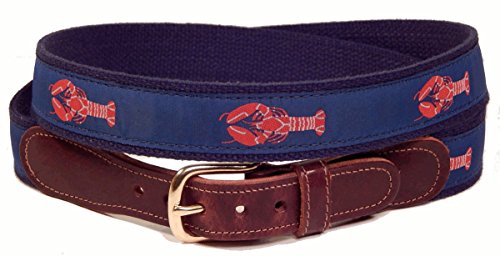 -. Brand : Preston Leather -. Color : Blue -. Department : mens -. Feature : Leather tabs / Sizing Information: Select belt size 2 inches longer than your pants waist size. When the waist is an odd size, increase the belt size by 3 inches / Brass buckle / Ribbon has a repeating pattern of a red lobster on a dark blue background, sewn into a 1 1/4 inch wide navy blue webbing. / Made in the USA -. ProductGroup : Apparel -. ProductTypeName : APPAREL -. Title : Preston Leather Lobster Belt Blue