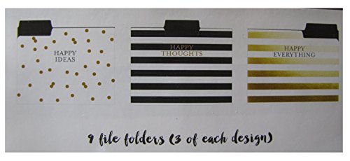 -. Feature : Graphique File Folders, 9 count, 3 of each design / Three Gold/White stripe, black inside (3) Happy Everything / Three white with gold dots, black inside (3) Happy Ideas / Three Black/White stripe, black inside (3) Happy Thoughts