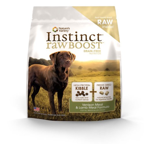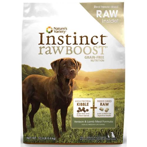 Instinct Raw Boost brings you high protein grain-free kibble plus freeze dried raw pieces together in the same bag – the perfect combination of convenience and nutrition to give your pet energy, vitality and vibrant health. Instinct kibble provides grain-free, gluten-free nutrition like a dog would eat in nature. A high protein, nutrient rich diet may help your dog maintain ideal weight and lean muscles. Additionally, the freeze dried raw pieces provide pure nutrition for digestive health, nutritious oils for healthy skin and coat, and a great taste your dog will crave. Formulated to mirror your dogs' ancestral diet, it's never been easier to nourish your dog with the pure and wholesome nutrition of raw. Made in USA facilities.Feature