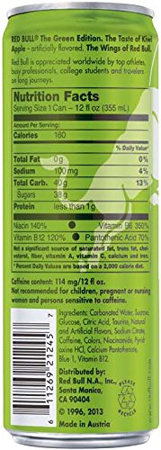 RED BULL GREEN EDITION. SAME WINGS, CHOOSE YOUR TASTE. Red Bull Green Edition is a carbonated beverage that combines the wings of a Red Bull Energy Drink with the taste of kiwi apple - artificially flavored. WHEN TO DRINK Red Bull is a great energy drink to have by your side, and is appreciated throughout the world by top athletes and busy professionals to college students and travelers on long journeys. For those who need WINGS for intense meetings or creative brainstorming sessions, on the field with teammates or competitors, or simply want to get the most out of life, a chilled can of Red Bull Green Edition Gives You WINGS. WHAT'S INSIDE THE CAN Caffeine- was well known for its stimulating effects by ancient civilizations who consumed it from natural sources like tea, coffee, cacao beans & cola nuts. Taurine- is an amino acid, naturally occurring in the human body and present in commonly consumed foods. It is involved in a wide range of biological processes. B-Group Vitamins- are essential micronutrients that are required for maintaining normal body functions Sucrose and Glucose- are different types of sugars which are also contained in commonly consumed foods. Water- Naturally, water is a key ingredient of Red Bull.