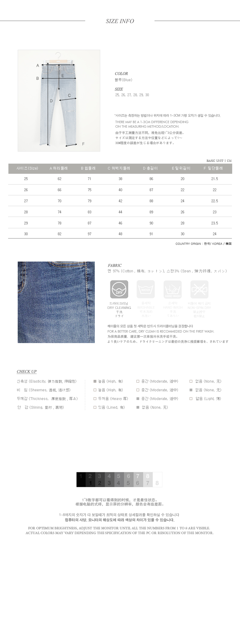 발끝까지 매력적인 룩을 완성해 주는그라데이션 워싱의 데님스키니에요!다가오는 봄시즌 산뜻하게 즐길 수 있는 밝은 워싱의 그러데이션 데님이구요흔하지않은 디자인으로 소장가치가 높아요~프론트와 밑단의 헤짐 디테일이빈티지한 스타일도 보여주는 아이템이구요발목까지 타이트한 핏으로 날씬한다리라인을 보여주는 스키니에요!심플한 탑에 가볍게 매치해도스타일이 살아나는 그라데이션데님이랍니다^^