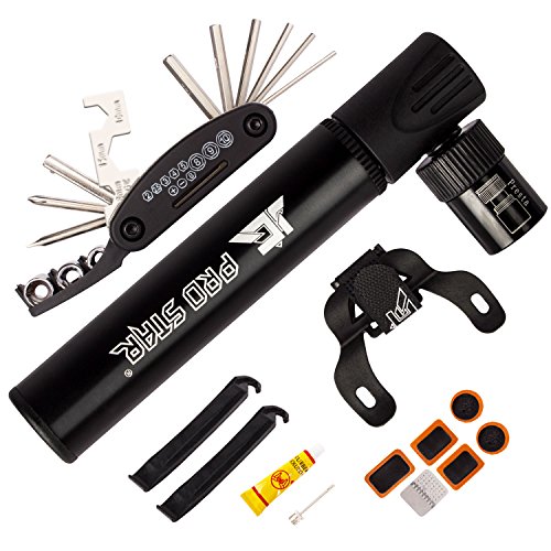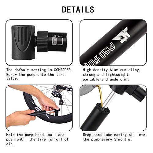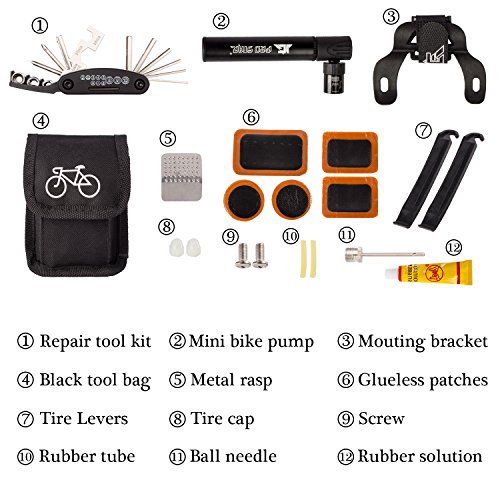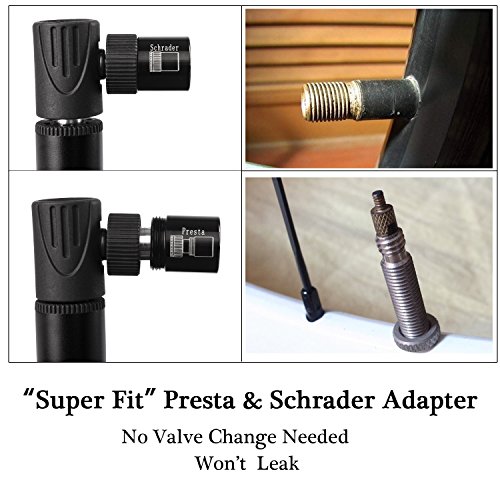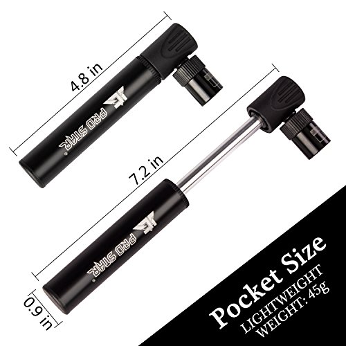 -. Feature : NO VALVE CHANGING NEEDED - Mini cycling pump is automatically compatible with both Presta & Schrader ! / SO MINI AND LIGHT YOU CAN CARRY IT ANYWHERE. This bike air pump will fit in the palm of your hand, but more importantly you can store it in your saddle rack bag, hydration pack, backpack and it might even fit in the back pocket of your cycling shirt. It measures just 4.7 inches long and weighs only 1.5oz, so taking it with you is a no-brainer / PUMPING HAS NEVER BEEN SO QUICK & EASY. It's quick, efficient and it's so light you can't even tell it is there. Unlike cheap alternatives, this bicycle pump has a stroke that is almost the size of the pump, which means it puts in plenty of air per each pump / BONUS - A Black Bag carry Ball Needle / Multi-function Bike Repair Tool / 2 pcs Metal Bicycle Tire Levers / 5 Glueless Patches / 1 Metal Tire Rasp/ bike frame mount- attaches securely to your bike. Velcro holds your portable tire pump firmly in place. helping you fix most problems of bikes when you are riding outside. / 2-YEAR QUALITY GUARANTEE - We offer 90 Days Money Back Guarantee and 24 Months Replacement Warranty - We're so confident about the quality of our products that we provide 2-year quality Guarantee, allowing you to BUY WITH CONFIDENCE for WORRY FREE shopping!