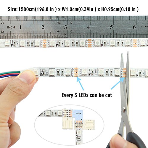 - High Quality LEDS: The super bright 5050 SMD 16.4ft Non- Waterproof Flexible LED RGB Light Strip can be cut in every 3 leds. LED light strip has long life span ( in excess of 50,000 hours). Low power consumption and environmental friendly.