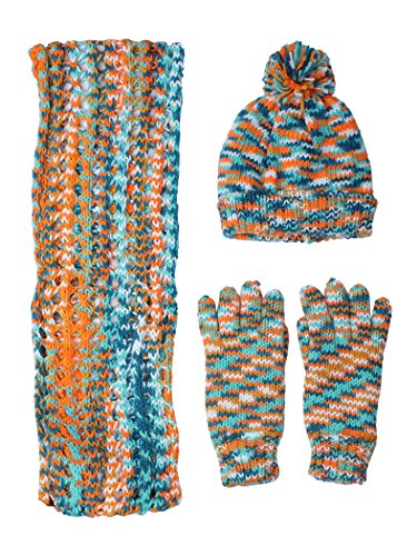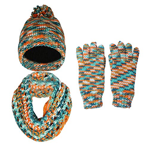 Binding : Apparel Product Description Colorful space dye knitted hat, scarf gloves set for girls ages 7-14 years old. Features a soft fleece lining in the hat and gloves for added warmth. The infinity scarf features an octagonal knitted design. Makes a great gift! Available for a limited time! 0