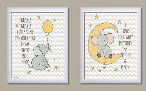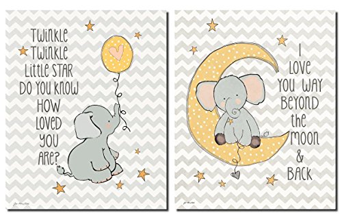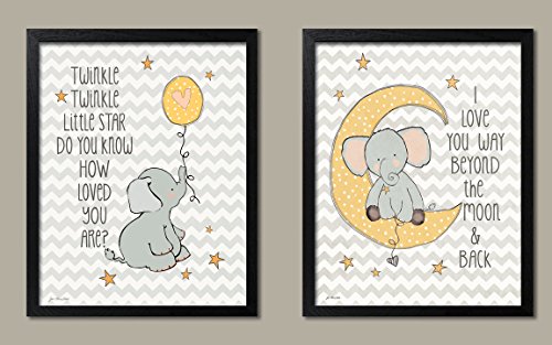 Two adorable Twinkle Love and To the Moon and Back Elephant set on chevron. This set makes a great addition to a child's room or nursery!