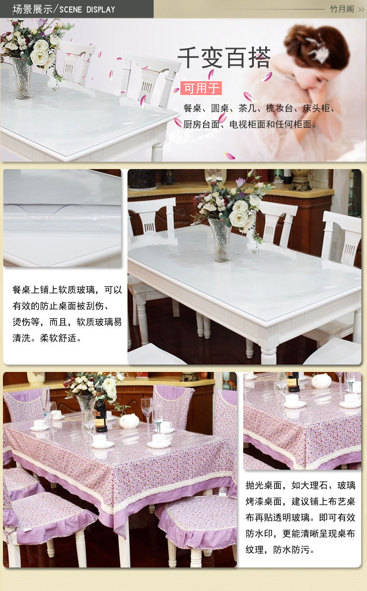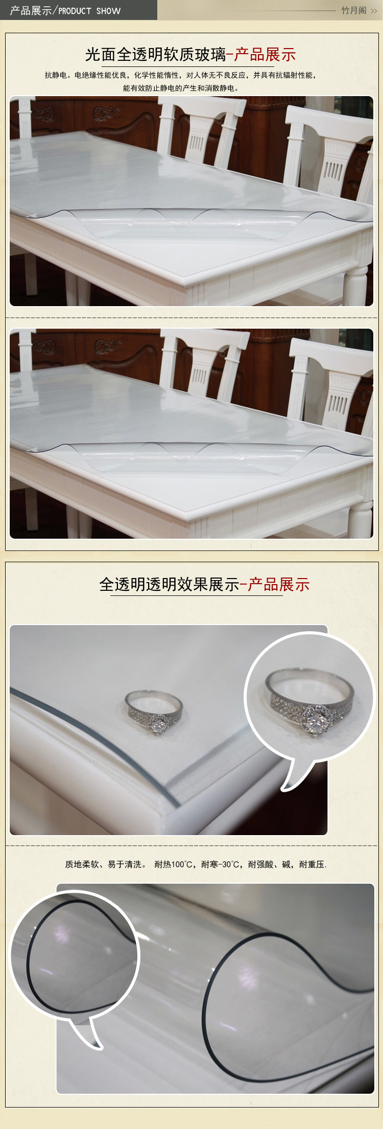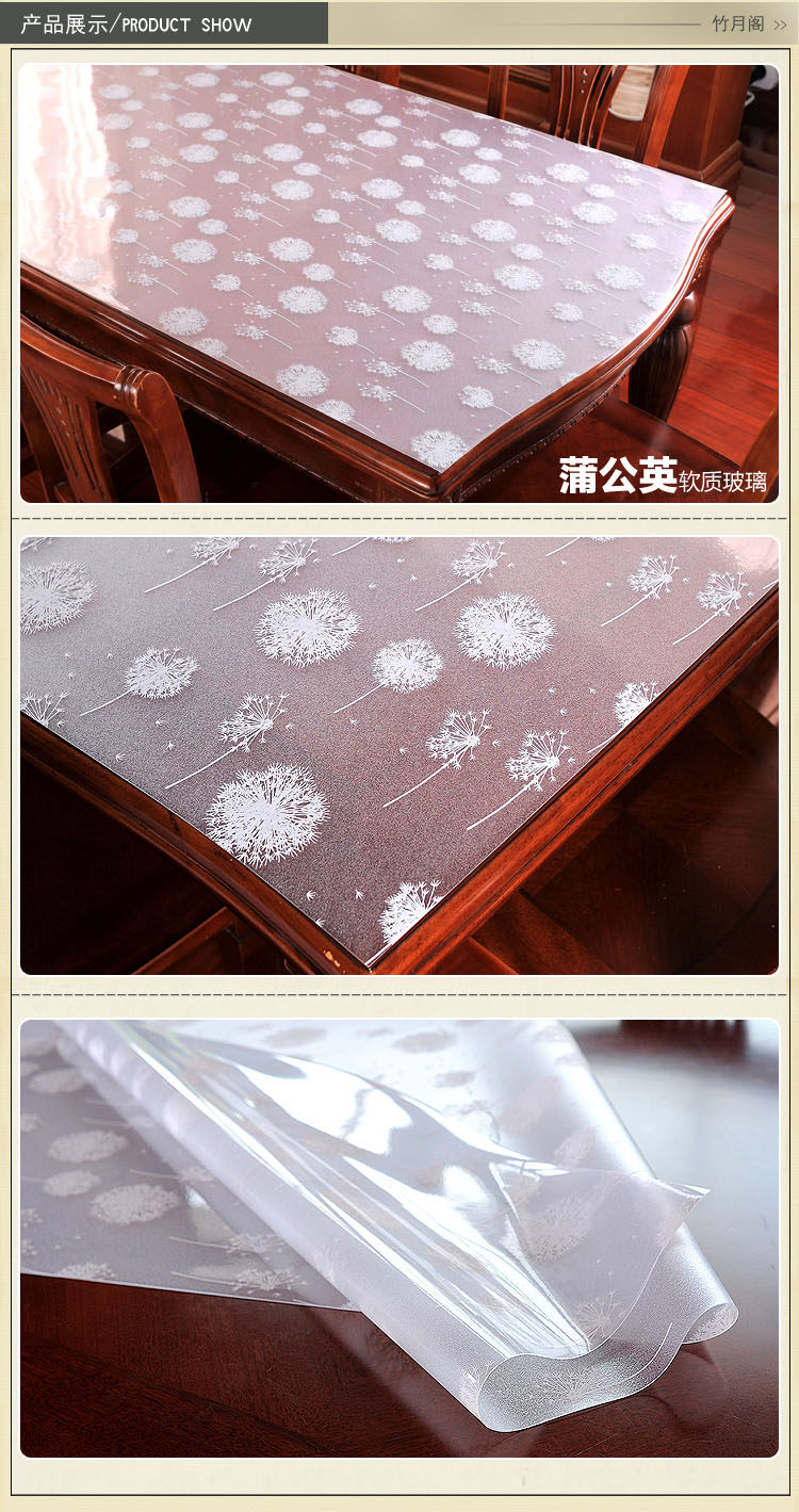 | Product description: | Soft PVC transparent glass is actually a soft board, is a high quality plastic composite material, the surface smooth, bright and transparent, no cracks, color uniformity. |
