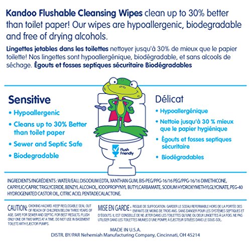 -. Feature : Kandoo Sensitive Wipes 100 Count Refills (Pack of 6) / Kandoo Flushable Cleansing Wipes clean up to 30% better than toilet paper / Flushable and Biodegradable, safe for sewer and septic systemsHypoallergenic / Does not contain drying alcohols / Moistened with lotion to be extra soft / Perfect for little hands- about the size of two pieces of toilet paper / Empowers kids to proudly say "I can do it myself"