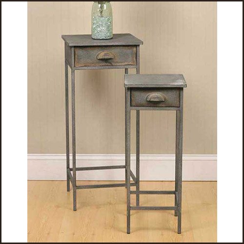 -. Feature : This pair of metal tables feature a small drawer with a pocket for a label. / Larger table measures 13" square and 30" tall. / Smaller table measures 10" square and 25" tall. / Features a textured, distressed grey finish.