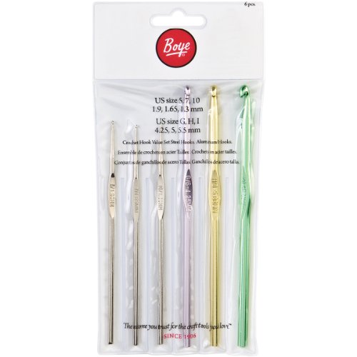 - Boye crochet hook set: sizes 5, 7, 10, g, h, i (1.9mm, 1.65mm, 1.3mm, 4-1/4mm, 5mm, 5-1/2mm)