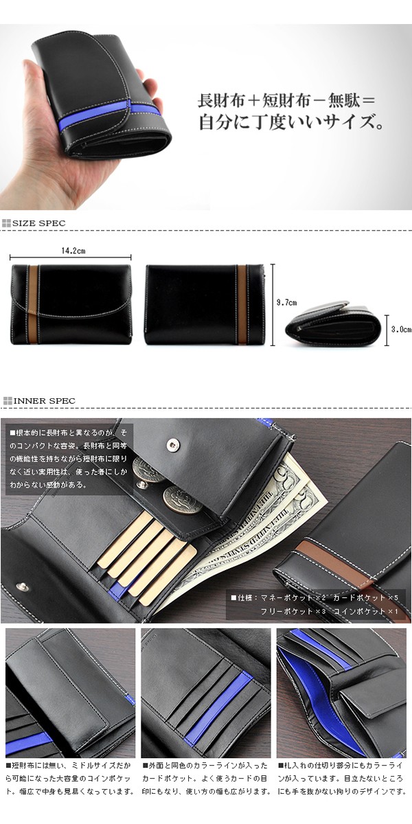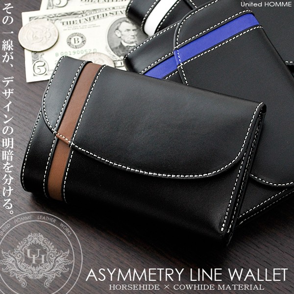 ユナイテッドオム United HOMME ホースハイド×アシンメトリーライン 3つ折り 長財布 短財布  商品仕様:(約)横幅14.2cm×高さ9.7cm×厚み3cm 外側:ホースハイド(馬革) 内側:牛革PVC(合成皮革) 箱入り