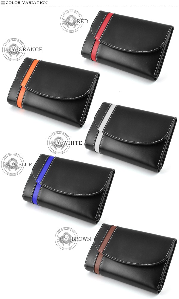 アシンメトリー(左右非対称)なカラーラインが斬新な三つ折り財布。艶やかなホースレザーのボディに差し色が映え、独特な雰囲気で見る人を魅了します。ライン部分はインレイ加工の技術を引用し、上から貼り付けるのではなく本体の内側に埋め込まれるように装飾されていて、本体との境界線に生まれる凸凹がコントラストを与え、高級感を醸し出しています。また、外面と同様のカラーラインをカードポケット、そして札入れの仕切り部分にもデザインしており目立たないところにも手を抜かない拘りの仕上がりとなっております。長財布と同等の機能性を持ちながら二つ折り財布に限りなく近い実用性。そして、カラーラインを施した、遊び心溢れるデザイン性。United HOMMEが提唱する新しい財布の誕生です。