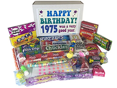 -. Binding : Misc. -. Brand : Woodstock Candy -. Feature : Contains 30 kinds of retro nostalgic candy / 1975 Birthday Gift Box is filled with nostalgic candy that will bring back great memories / Makes a fun and unique birthday gift for any candy lover / Perfect gift for the person who has everything / Box measures 9.5 x 7 x 3 inches and comes shrink wrapped -. Label : Woodstock Candy -. Manufacturer : Woodstock Candy -. PackageQuantity : 1 -. ProductGroup : Grocery -. ProductTypeName : GROCERY -. Publisher : Woodstock Candy -. Studio : Woodstock Candy -. Title : 1975 42nd Birthday Gift Box of Retro Candy from Childhood Jr