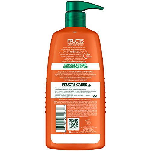 Hair is almost entirely made up of protein, which gives hair its strength. Paraben-free Fructis formulas with Active Fruit Protein, an exclusive combination of citrus protein, Vitamins B3 & B6, fruit & plant-derived extracts and strengthening conditioners, are designed for healthier, stronger hair. Fortified Fructis Damage Eraser Shampoo with Amla Oil Extract and Phytokeratin, plant-based amino acids similar to those naturally found in hair, helps rebuild strength from root to tip to intensely repair damage from daily brushing, heat styling, repeated coloring or chemical treatments. • Damage repair in 1 use with Damage Eraser shampoo, conditioner and leave-in treatment • Shampoo for distressed, damaged hair • With Amla Oil Extract • Fortified formula helps rebuild strength to intensely repair damage from daily brushing, heat styling, repeated coloring or chemical treatments *With shampoo, conditioner & leave-in treatment. PHYTOKERATIN is a trademark of Lonza or its affiliates. It’s more than Amla Oil Extract… it’s a fortifying replenisher to repair damage in one use.* Paraben-free Damage Eraser shampoo, conditioner and treatments help rebuild strength from root to tip to intensely repair damaged hair. *With shampoo, conditioner & leave-in treatment. Massage onto wet hair, lather and rinse thoroughly. Follow with Damage Eraser conditioner and leave-in treatment.