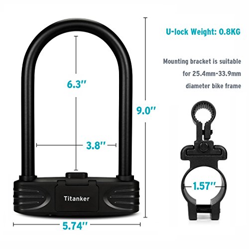 -. Feature : SAFETY & SAVE YOUR MONEY: Titanker U lock is made of 12mm hardened performance zinc alloy shackle and covered by a 3.85mm PVC coating. This 16mm Bike Lock which comes with 4-foot flex cable and Mounting Bracket provides you with high-quality bike security in all areas to save your money. The U lock weight is 0.8kg, the steel cable is 0.4kg. / KEYLESS & SAFETY: With keyless design, no worry about key lost and forget to carry. Set your own 4-digit combination allows to prevent thieves use universal key to unlock your lock. / HEAVY DUTY LOCK PROVIDE YOU MORE SAFETY: 16mm heavy duty shackle and cylinder is made of solid zinc alloy. Then it can resist cutting & leverage attacks, and provide your bike more safety. / DUST COVER & DURABLE: The combination is covered by a dust cover to protects and extends cylinder life. Whole lock is covered by quality PC material for good looking and keep your bike from scratching. / 100% MONEY-BACK GUARANTEE: If you are not satisfied with our heavy duty U lock, please return it within 30-DAYS and get a full refund, NO questions asked. We stand behind the quality of all our products.