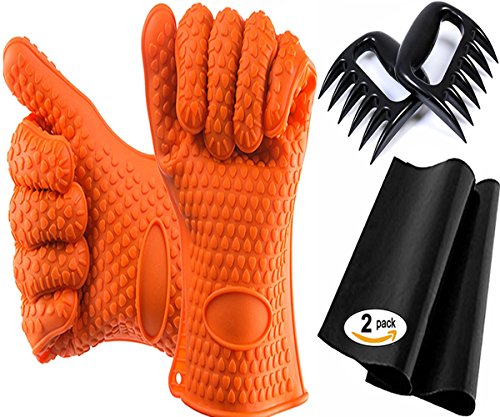 Complete Set For Grill/Oven/Barbecue - Silicone Gloves + 2 Non-Stick Mats + Pair of Meat Claws | Perfect Set as a Gift | FDA Approved, BPA Free