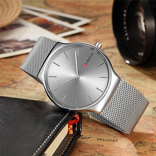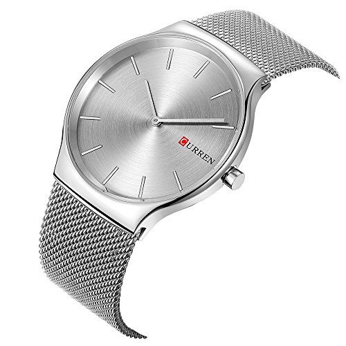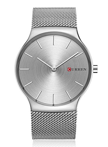 CURREN 손목시계 맨즈 심플 초박형 아날로그 바 인덱스 스테인레스 밴드 메쉬 슬라이드 버클화이트실버