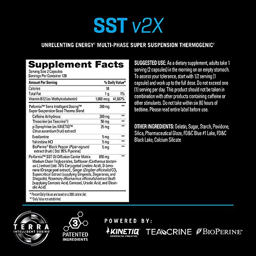 -. Binding : Health and Beauty -. Brand : PERFORMIX -. EAN : 0811274023684 -. Feature : UNRELENTING ENERGY: PERFORMIX SST v2X delivers an immediate surge of extreme energy that will propel your performance beyond what you thought possible. Terra Time-Release Technology sustains this powerful stimulant effect in multiple phases for extended benefits. / ADVANCED FAT METABOLISM: This next-level formula is designed to ignite your metabolism for a truly ripped physique. Achieve your ultimate body composition goals with unparalleled fat burning and lean muscle development. / HEIGHTENED MENTAL FOCUS: Cognitive power drives physical performance. Caffeine promotes acute alertness while Teacrine® sharpens mental stamina with smooth and sustained energy. / PRODUCT USAGE: Take 1-2 capsules in the morning to get energized and boost your metabolism. / MADE IN U.S.A: Manufactured in a FDA registered facility. All PERFORMIX products are produced in facilities using cGMP (current Good Manufacturing Practice) standards and pass rigorous testing. -. IsAdultProduct : 0 -. Label : PERFORMIX -. Manufacturer : PERFORMIX -. MPN : 511433 -. PackageQuantity : 1 -. PartNumber : 511433 -. ProductGroup : Health and Beauty -. ProductTypeName : HEALTH_PERSONAL_CARE -. Publisher : PERFORMIX -. Size : 60 servings -. Studio : PERFORMIX -. Title : PERFORMIX SST v2X Suspension Super Thermogenic, Unrelenting Energy, Fat Burner, Mental Focus - 120 capsules -. UPC : 811274023684