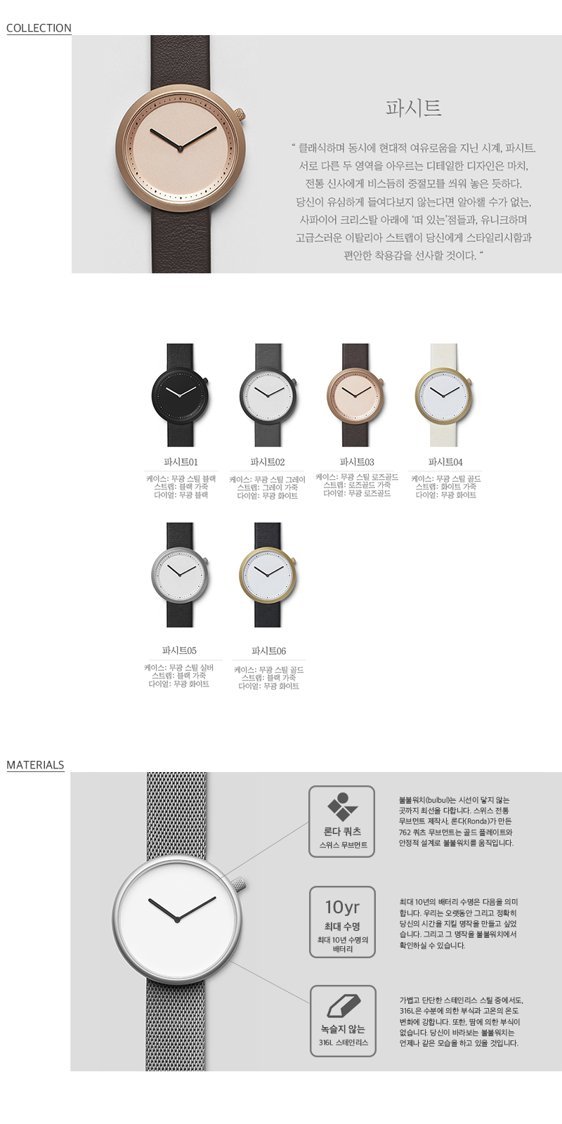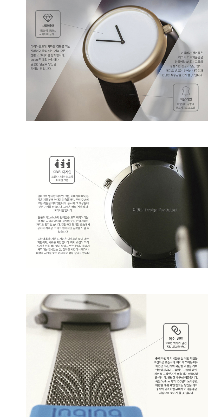 | - 불불(bulbul) "북유럽에서 온, 현대적 감성의 디자인 워치" 세계를 거닐던 여행가, 제이콥 줄(Jacob Juul), 미니멀 디자인의 애호가이기도 했던 그는 2013년 자신의 철학을 투영한 불불워치(bulbul watch)를 세웠습니다. 디자인을 맡은 북유럽 최고 디자이너 그룹인 키비시(KiBiSi)는 겉모습부터 모든 재료 선정에 자신들의 철학이 담기길 원했습니다. 그 때문에 첫 컬렉션 페블(Pebble)을 내놓기까지 수 년의 제작시간이 걸렸지만, 전통적이고 보수적인 시계 산업을 새롭게 해석했다는 평가로 주목받았습니다. 이어 오랜 전통과 현대적 세련미를 동시에 담은 파시트(Facette)와 시계의 본질만을 남긴 채 모든 것을 걷어낸 오어(Ore)를 출시했습니다. 그들은 제품에 ‘시계의 기능’이 아니라, ‘철학적 디자인’을 담습니다. 궁극적으로 불불워치가 실현시킨 3가지 컬렉션은 모두 현대적 감각을 기반으로 완성되었습니다. 그 특징은 뛰어난 내구성과 오래두고 볼 수 있는 심미성, 외견에 나타난 여유로움입니다. 초침마저 덜어낸 미니멀리즘은 바쁜 일상 속에서 여유를 찾는 현대인에게 안식처를 선사할 것입니다. - 파시트(Facette) 컬렉션 “고전적인 아름다움과 현대적인 감각의 조화” 파시트(Facette)는 불불(bulbul) 컬렉션에서 선보이는 두 번째 디자인입니다. 둥글고 세련된 모양의 파시트는 상징적인 시계 모양을 지향하지만, 독특하고 세부적인 디자인을 포함하고 있습니다. 시계침들은 사파이어 크리스탈 밑면 위를 거의 눈에 띄지 않을 정도로 미끄러지듯 움직인답니다. 최고급 재질을 이용해 제작하였기 때문에 뛰어난 강도와 내구성을 자랑합니다. 이는 키비시 설계의 특징인 미학적 지속성에도 부합합니다. 녹슬지 않는 316L 스테인레스 소재로 된 본체 안에는 최대 10년의 배터리 수명을 지닌 스위스제 도금 포쥬얼 론다 무브먼트(four jewels Ronda Movement)를 탑재하였죠. 또한 시계 유리는 일상에서 발생할 수 있는 스크레치를 방지하는 사파이어 크리스탈을 사용했고, 시계 스트랩은 이탈리아 가죽을 사용하여 제작했답니다. 파시트의 측정(사이즈) 치수는 가로 37mm x세로 40mm x 두께 8mm이고 3기압 생활 방수를 지원합니다. |