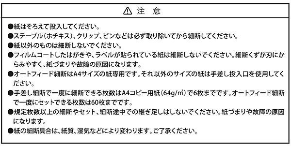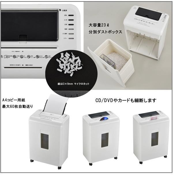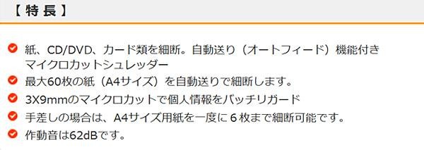 | 最大60枚の紙(A4サイズ)を自動送りで細断します。3×9mmのマイクロカットで個人情報をバッチリガード!!手差しの場合は、A4サイズ用紙を一度に6枚まで細断可能です。紙だけでなく、CD/DVD、カード類も細断することができます。 |