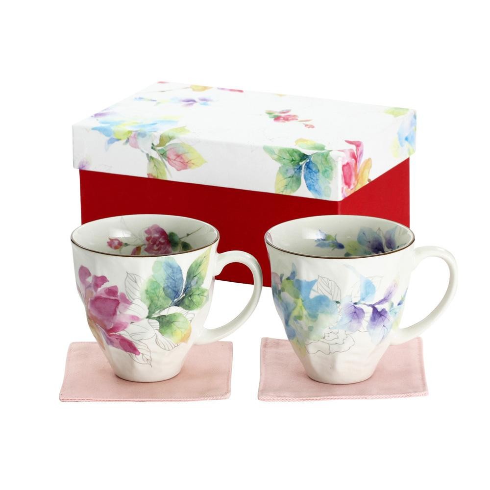 | ピンクとブルーの薔薇が鮮やかな、ばらの香。コースター付きマグカップのペアセットです。 |