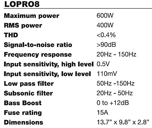 Sound Storm Laboratories has developed the perfect solution for attaining low frequency response when there is little availability of space. The LoPro8 is a one-stop shop for bass. This 8" low profile amplified subwoofer box will fit under many car seats or on the back wall of pick-ups. If you are in a tight spot, SSL's LoPro series has your solution. This unit is equipped with RCA low level inputs, high level inputs, and a remote subwoofer level control. It also has thermal, short and overload protection circuits, low pass and subsonic filters, and a soft-delay remote turn-on. From Chevy Luvs to Lamborghinis, the LoPro8 (and LoPro10, the 10" version) will have you swimming in bass. This is further proof that SSL is a leader in mobile communications, and…everything else is just noise.Feature