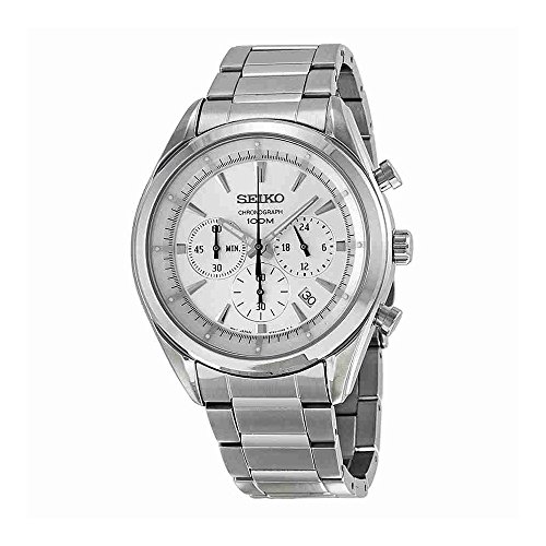 Stainless steel case with a stainless steel bracelet. Fixed stainless steel bezel. Silver dial with silver-tone hands and index hour markers. Minute markers around the outer rim. Dial Type: Analog. Luminescent hands and markers. Date display between 4 and 5 o'clock positions. Chronograph - three sub-dials displaying: 60 second, 60 minute and 24 hour. Quartz movement. Scratch resistant Hardlex crystal. Pull / push crown. Solid case back. Case diameter: 42 mm. Case thickness: 11 mm. Round case shape. Fold over deployment clasp. Water resistant at 100 meters / 330 feet. Functions: chronograph, date, hour, minute, second. Casual watch style. Seiko Chronograph Silver Dial Stainless Steel Mens Watch SSB085.Feature