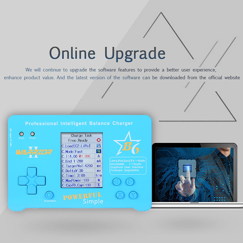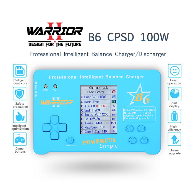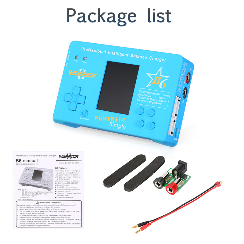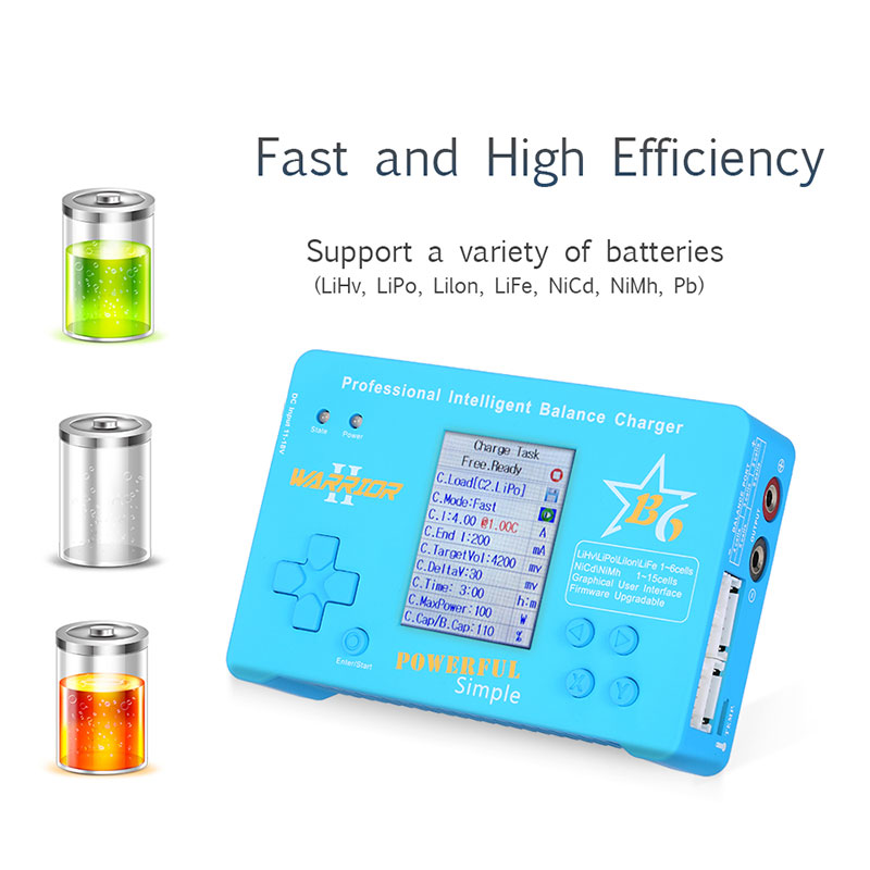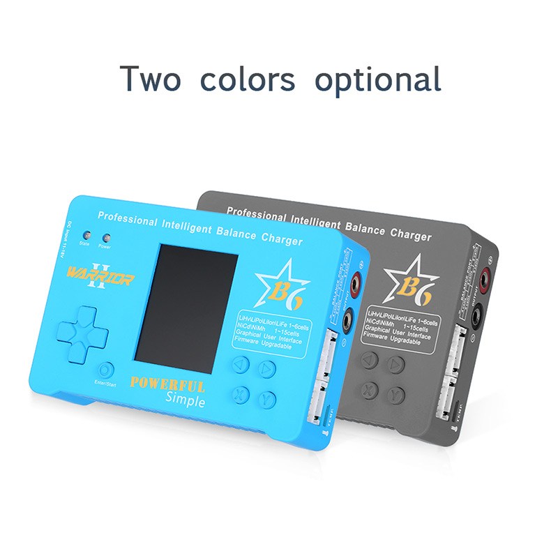 B6 charger is designed for LiHv, LiPo, Lilon, LiFe, NiMH, NiCd, Pb battery charge or discharge. It has the battery storage function. B6 has dual microcontrollers, 2.4-inch color LCD and fan cooling. It has battery and task parameter memory, and you can save three sets of input power and protection voltage. Real firmware upgrade function. Support the LogView software.